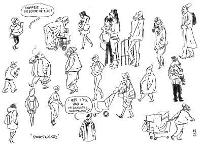 Tremendous! I visited Portland last year (from UK). These sketches reminded me of so much: view from my hotel, the food trucks, bookstores. I didn't see any strip joints though!