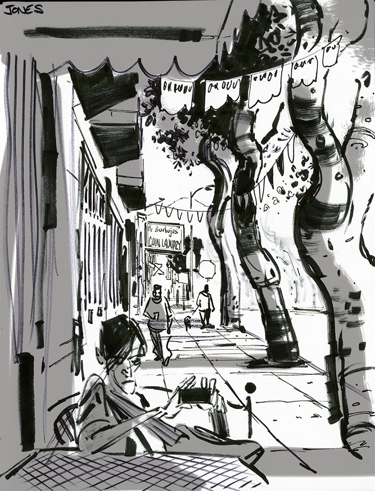 Drawing in a Mission dive bar with JSG, Melodie & Matt Cruickshank. Crookie did a finger drawing of an artist painting outside the window.