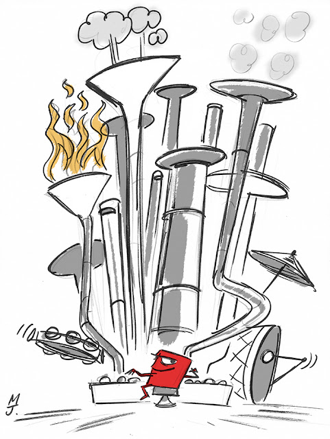 We considered musical instruments as a way of expressing emotion. Sadness would obviously have a harp or violin but I imagined Anger dwarfed by a giant percussive/organ instrument - like a one man band!